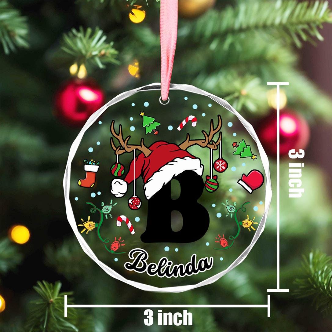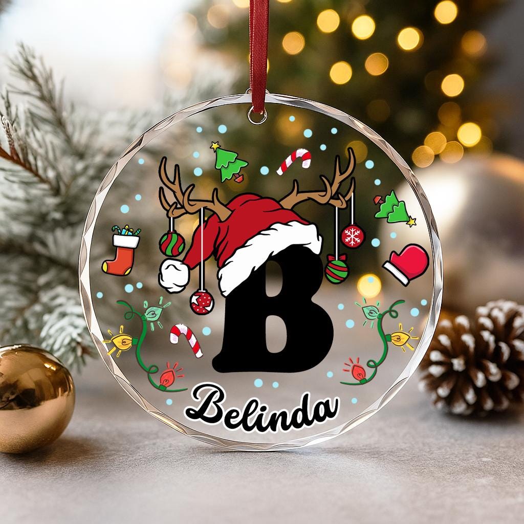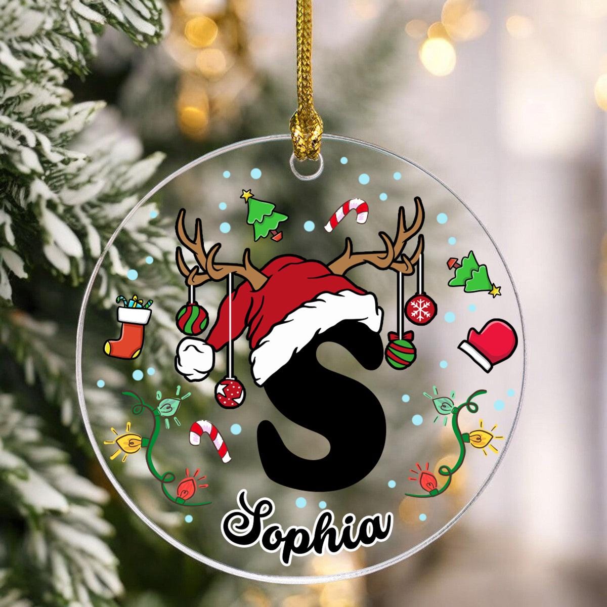 Personalized Christmas Alphabet Ornament. Features a Santa hat, reindeer antlers, and holiday doodles around the first letter of a name. Add a name beneath the letter.